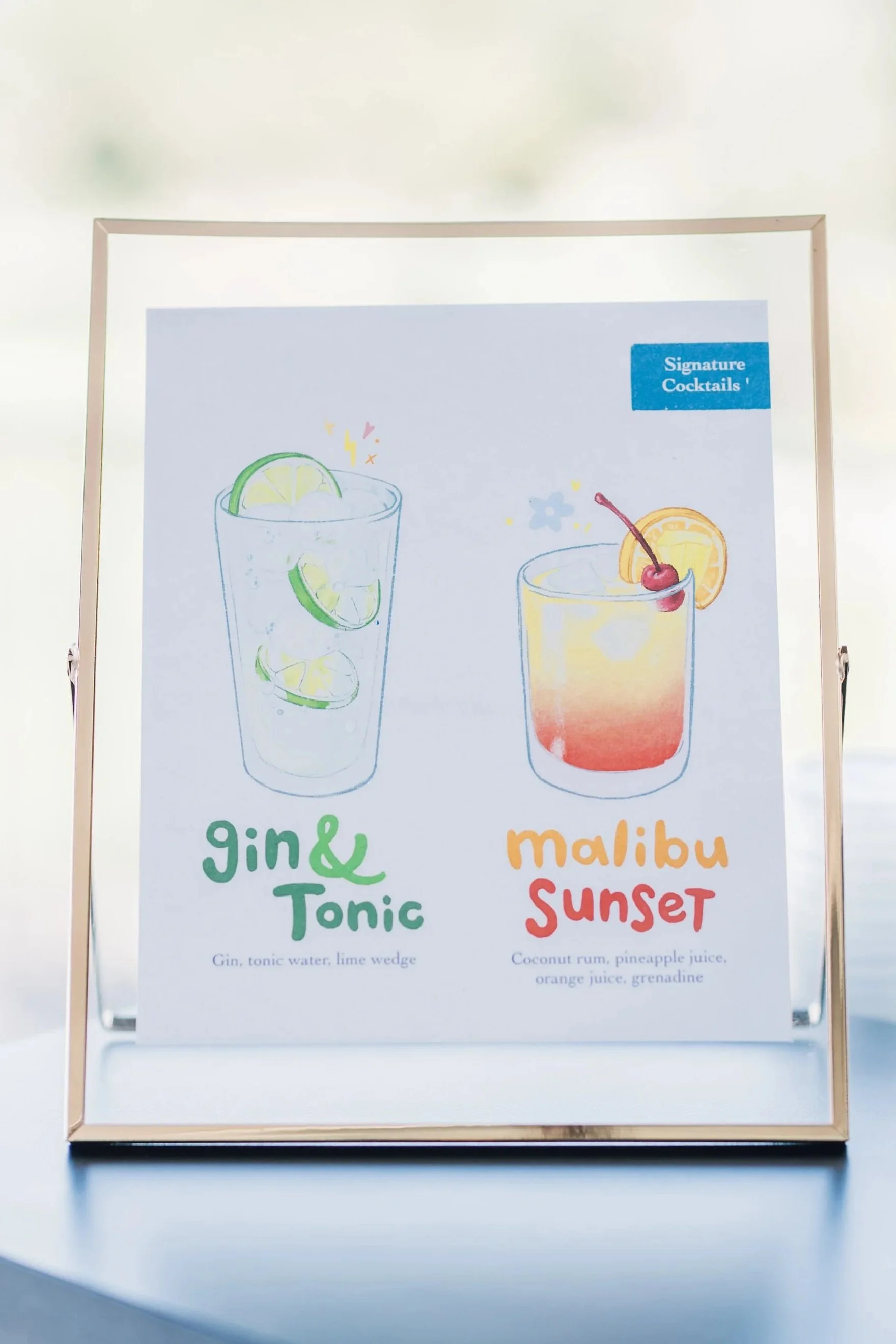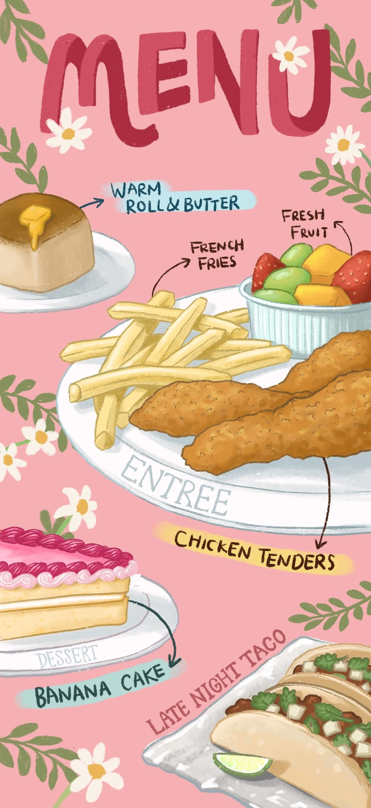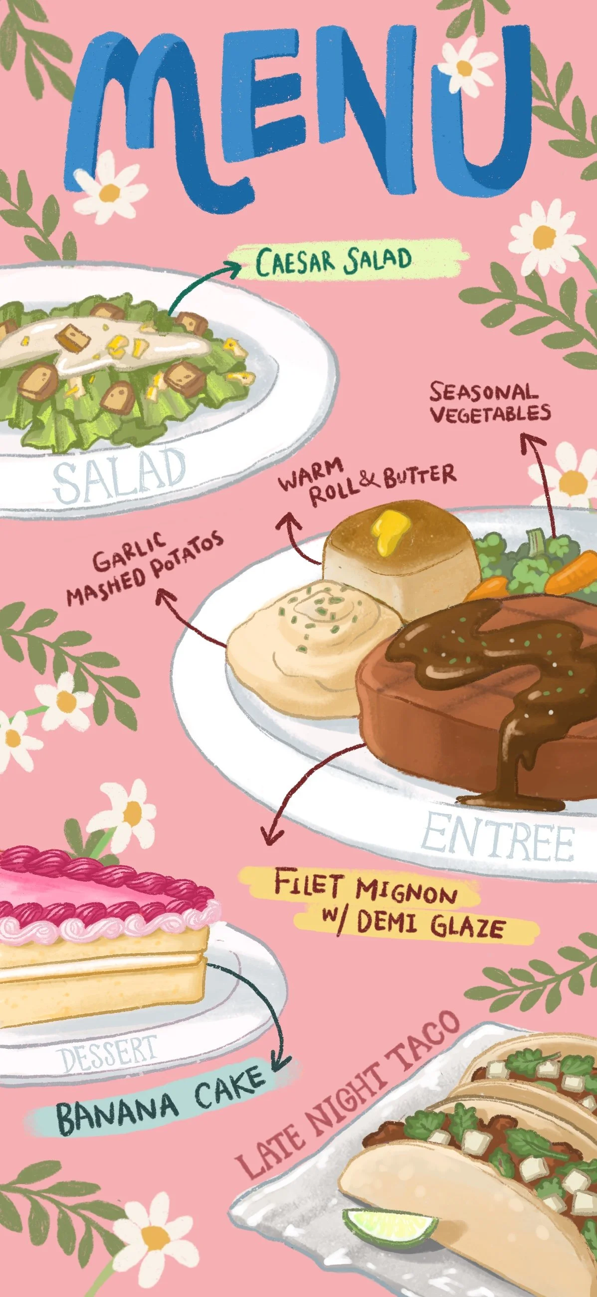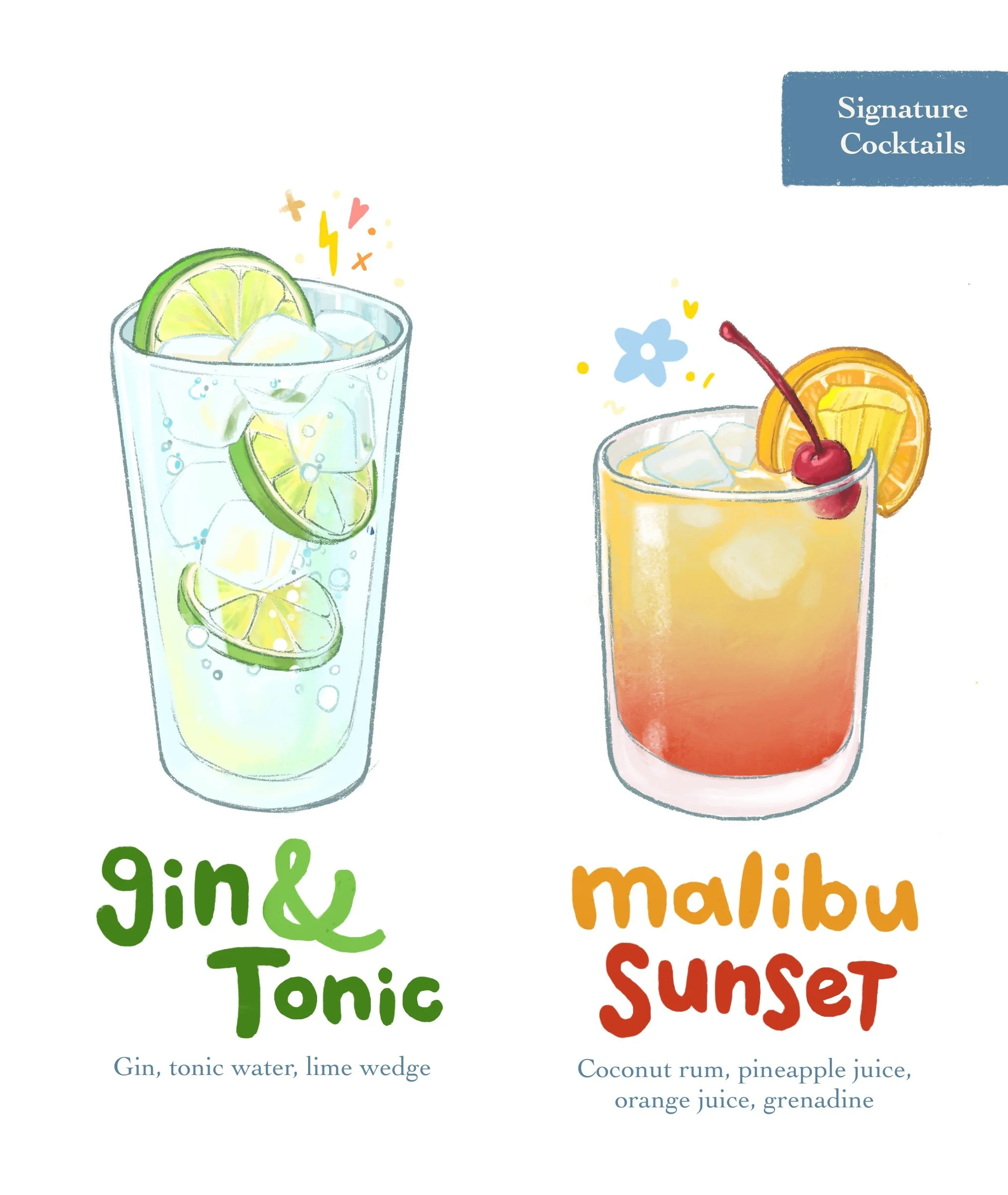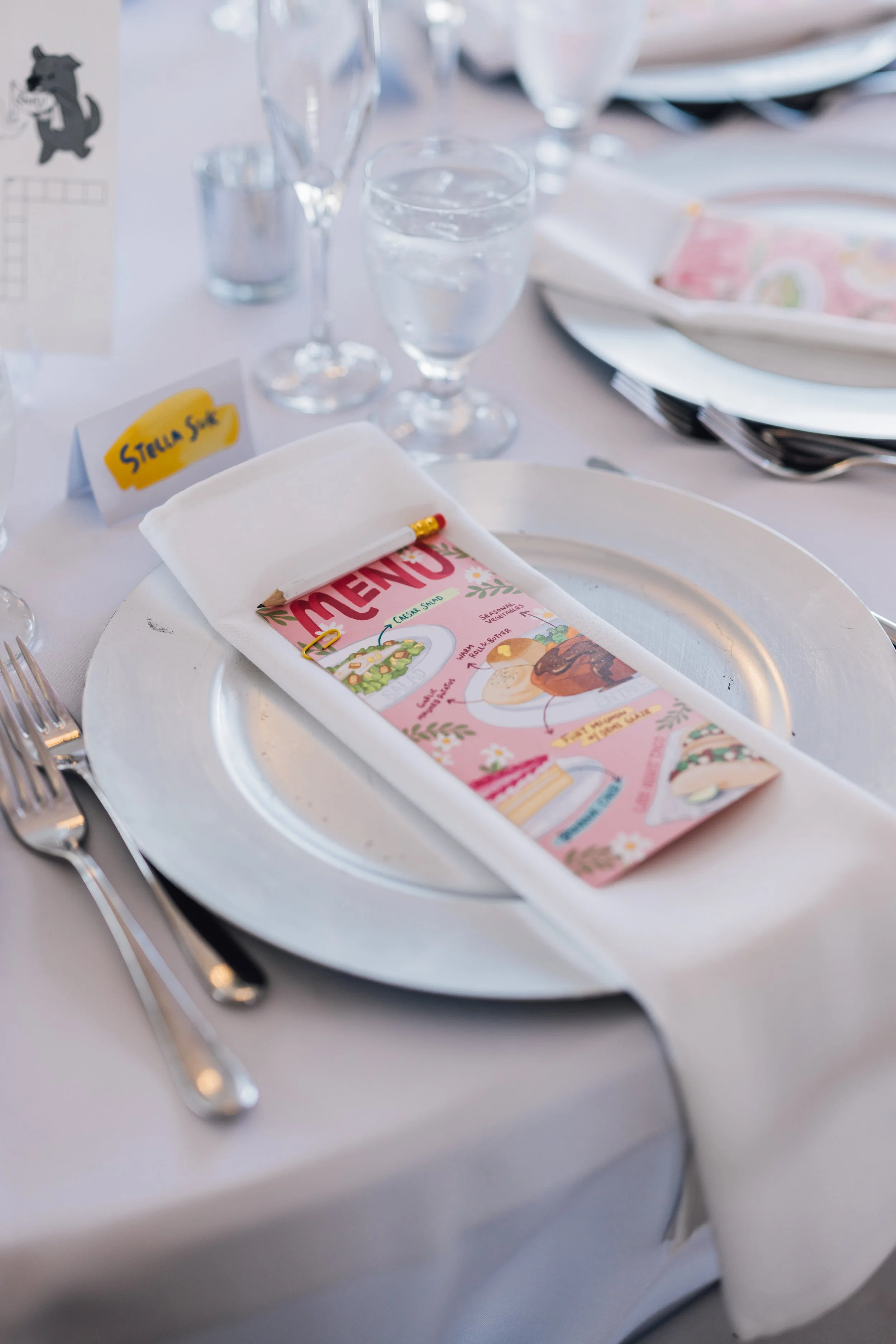 A custom wedding dinner and cocktail menu designed for a couple who want an illustrative style with vibrant colors. The final design captures a playful mood that reflects their vision of something cute, charming, and full of personality.